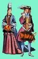 В то время французские дворяне носили камзолы длиной до колена. Эти камзолы не имели воротника, застегивались от ворота до талии. Рукава удлинились и подходили теперь ближе к запястью. Спереди, по подолу и по манжетам камзол был отделан плотно посаженными пуговицами и воздушными петлями. Шею закрывал полотняный шарф. Камзол носился без жилета, так что под ним обнаруживалась свободная сорочка. Штанины "блуммер" собирались под коленом на ленту так, что оставался напуск. Башмаки сужались к прямоугольным носам и застегивались поверх высокого язычка на ремешки и пряжки. Парик оставался длинным, причем обычно левая сторона была длиннее. Шляпа с низкой тульей называлась "лодочка". Большие перчатки с крагами отделывались кружевом и мехом. Принято было носить с собой трость.